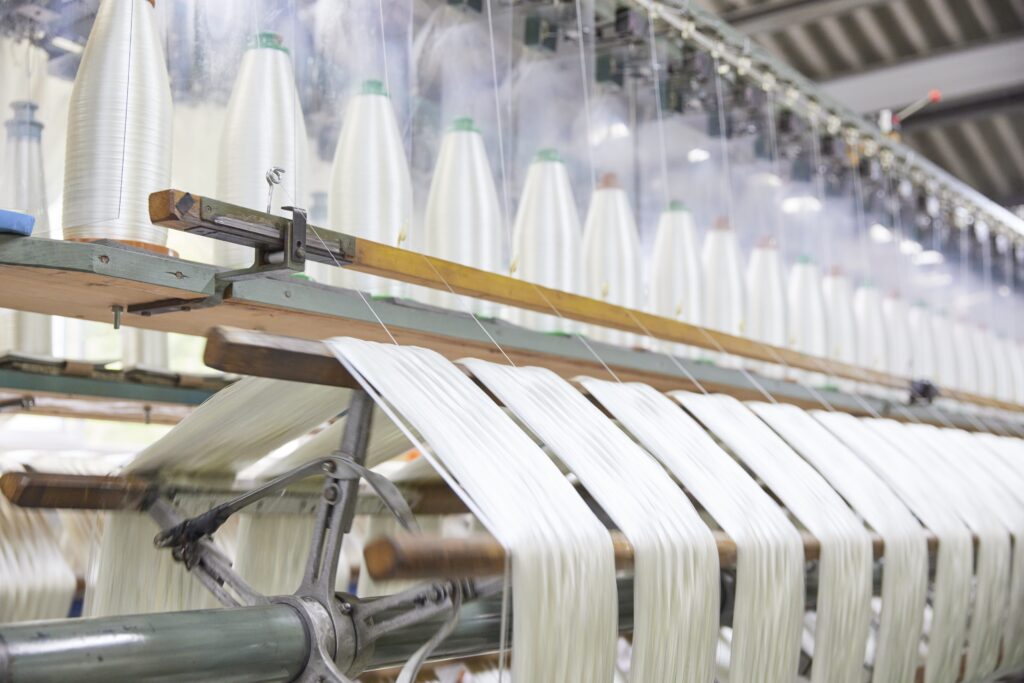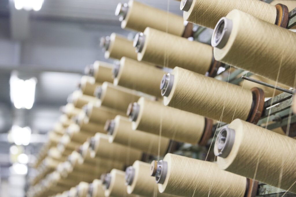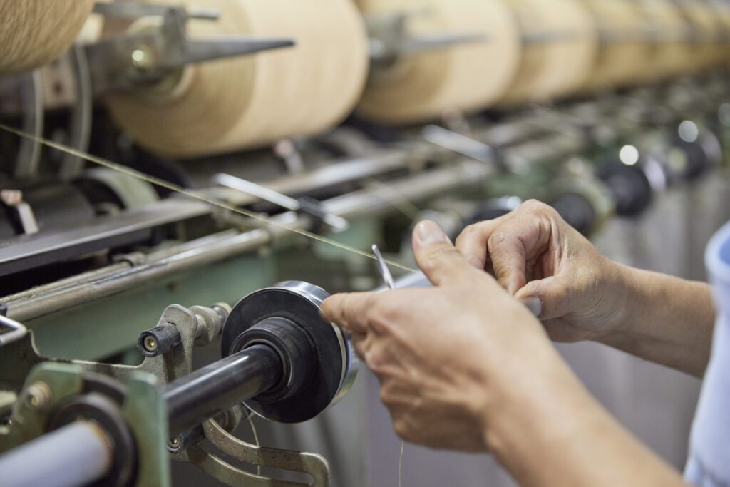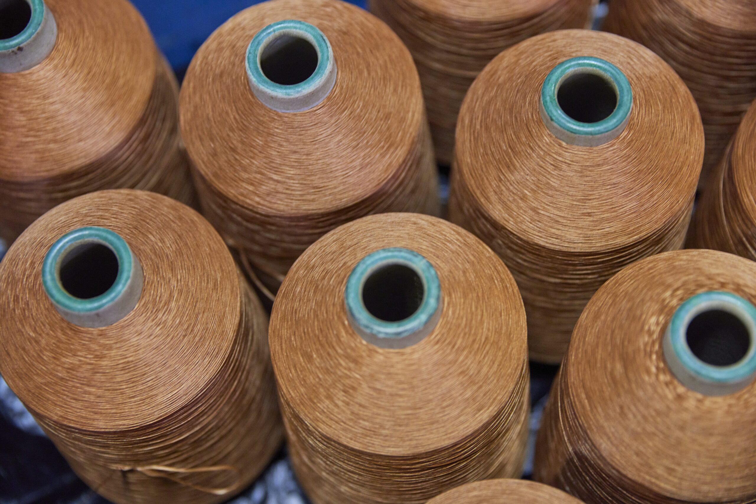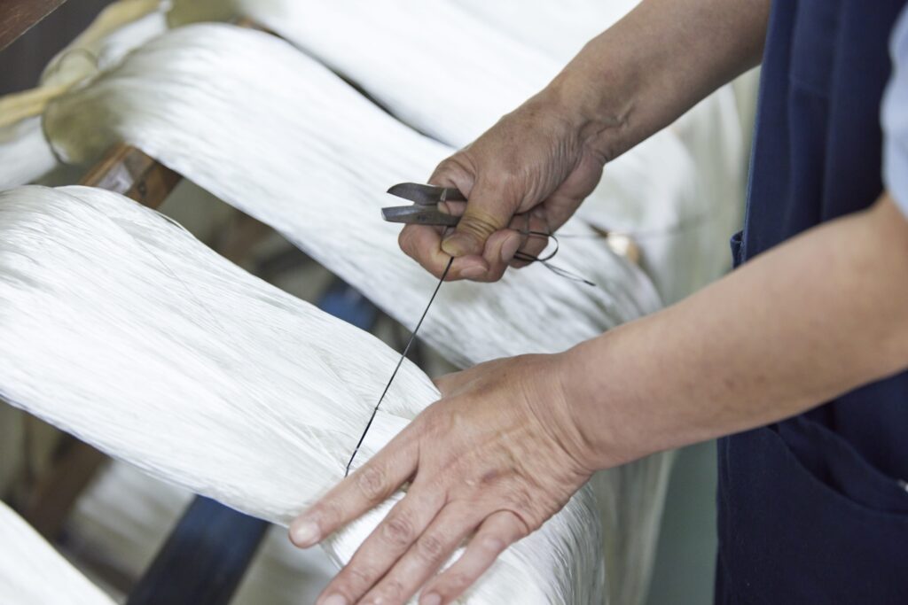 単糸もしくは複数本の糸を「撚る(よる)」ことでねじり合わせて、一本の糸として使えるようにする工程です。