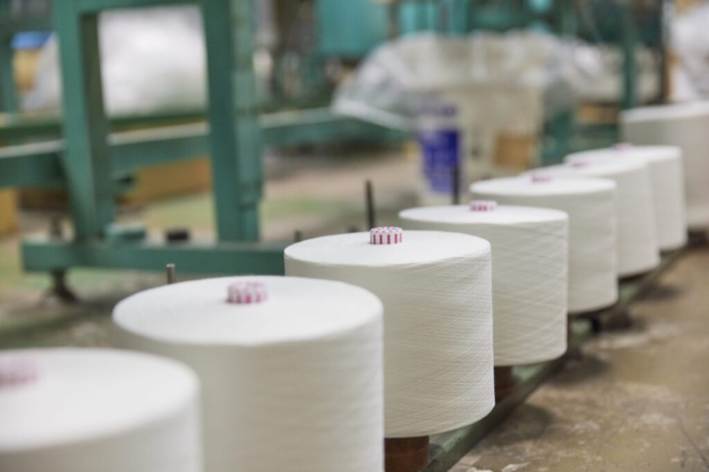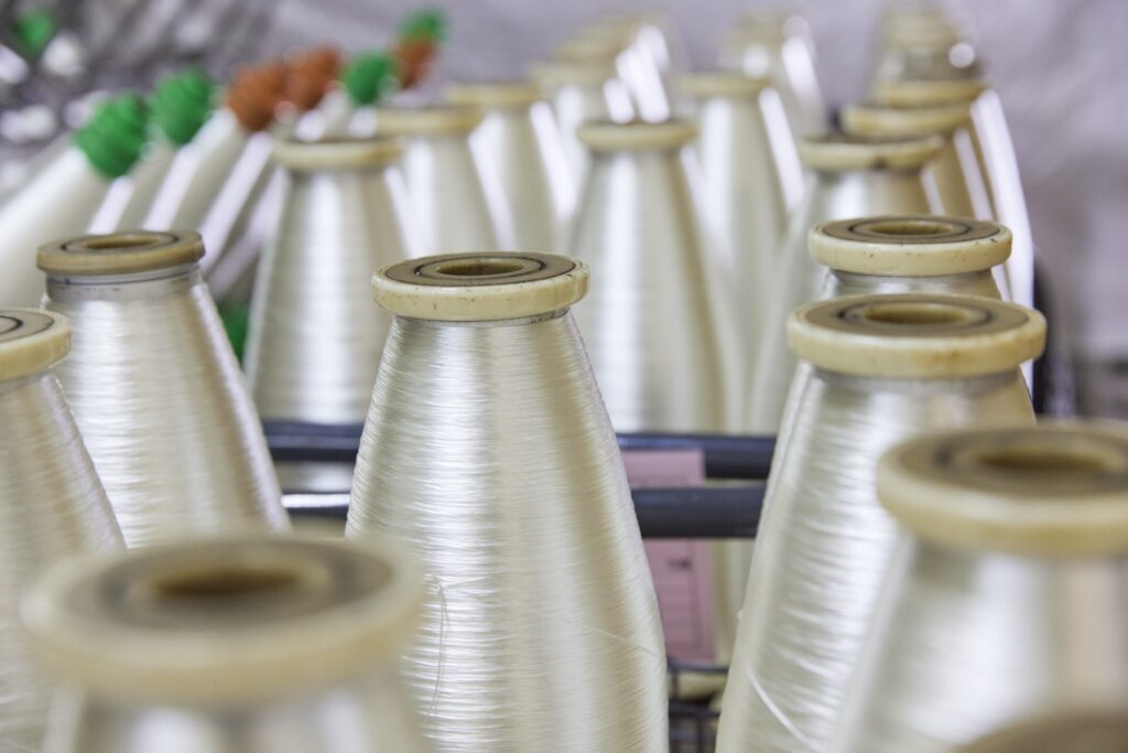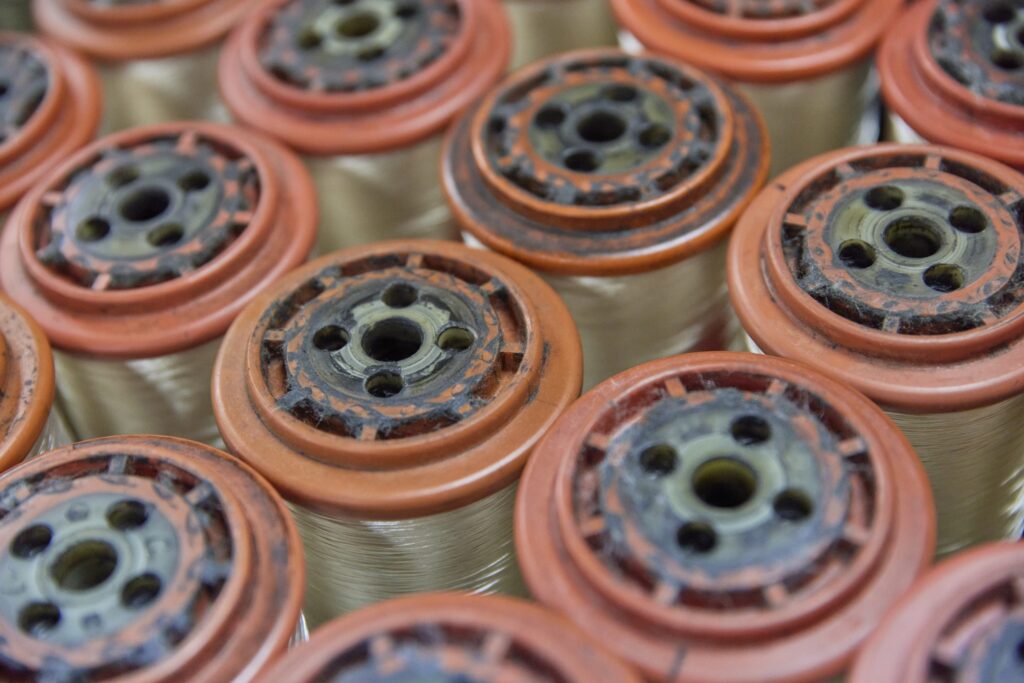 撚糸とは糸に撚り(より)をかけることで、糸をねじり合わせて一本の糸として使えるようにする工程です。この撚り回数や方法によって最終的な糸の強度やその他の特性が変化します。小巻は加工糸を紙管やボビンへ必要に応じた分量で巻き付ける工程になります。